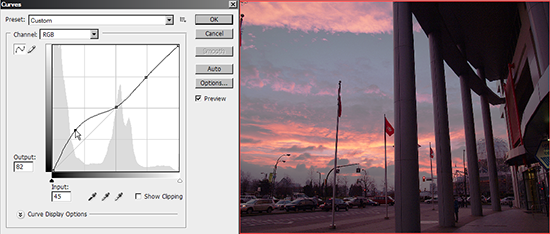 Similar to what we did in the levels dialogue box; select the red channel first; then drag the red curve lower to decrease the red value.