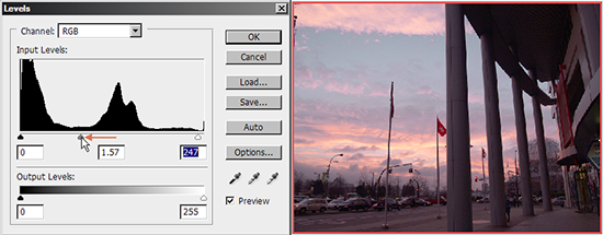 With Levels, we can correct the color, contrast, and brightness of parts and the entire image. Here we want to adjust the white balance and exposure of this street scene photo.
